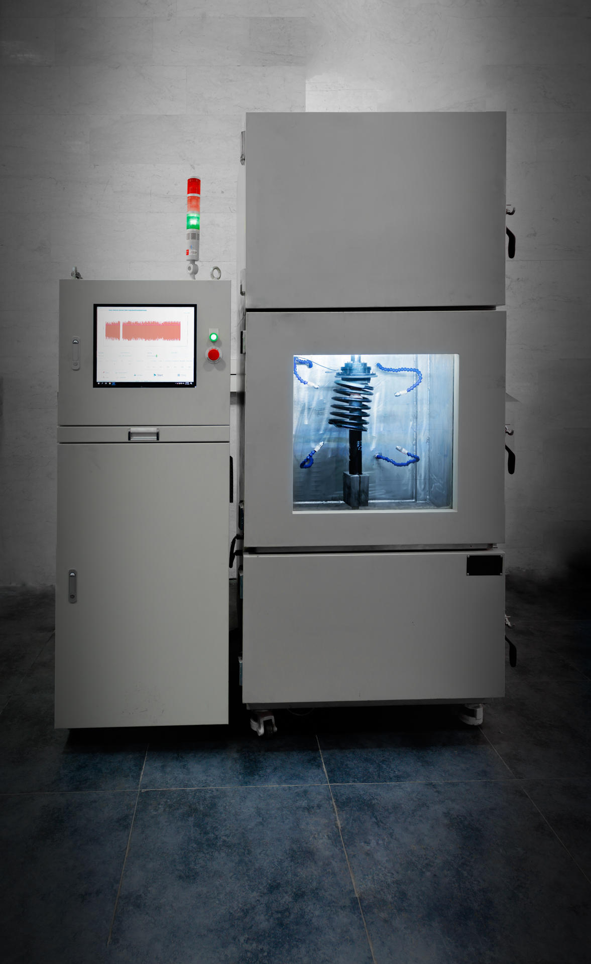 دستگاه توسط شرکت حرکت بلبرینگ ایمن و با توجه به حالت واقعی کمک فنر خودرو طراحی و تولید شده است و آزمایش عملکرد بلبرینگ کف گرد و پاشش گل و لای را در شرایط واقعی بررسی میکند.